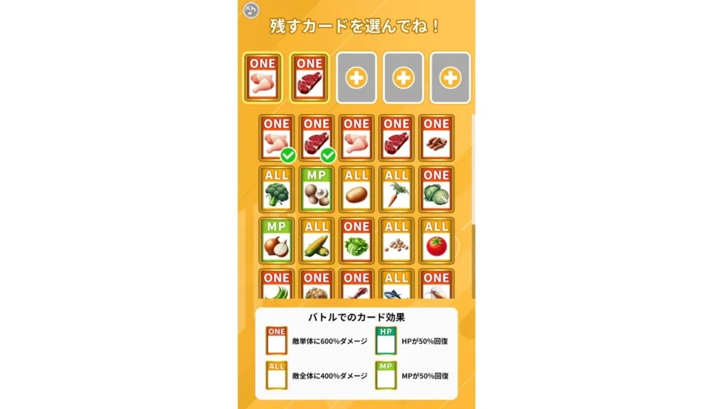 食材の種類が多いほどカード数が増えるため、偏食だとバトルでも不利になります。絶妙な設計です。