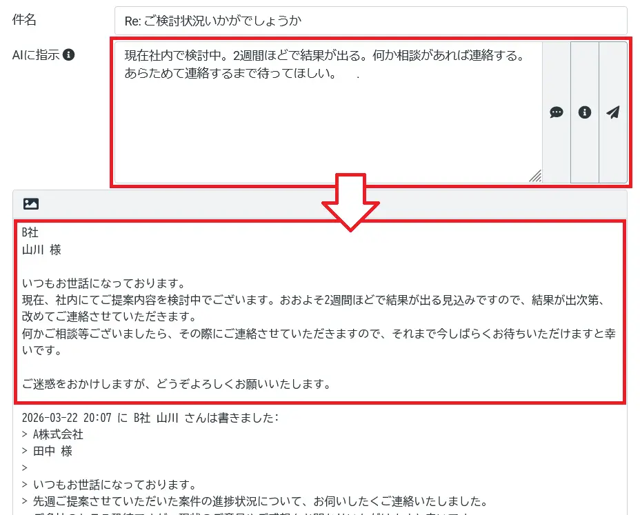| 返信サポート | 受信メールへの返信文も指示ベースで生成 |