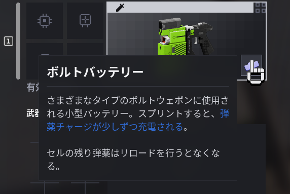 Zieglerが明確に注意していたポイントで、バッテリー武器は空になる前にリロードすると残量がそのまま消える仕様です。 バッテリー武器を使うときは、使い切ってからリロードするのが鉄則です。