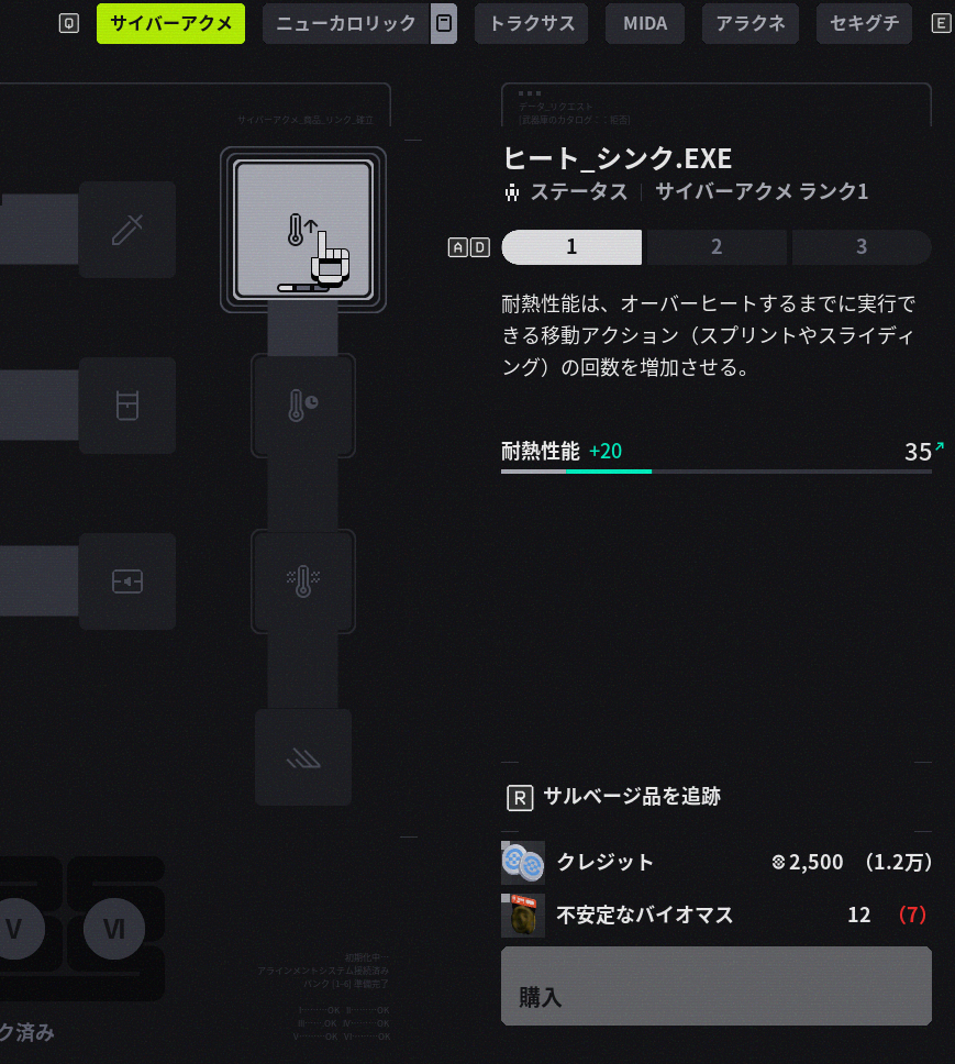 スプリント、スライド、Shellのアビリティ使用でHeatゲージが上昇します。 上限に達するとオーバーヒートが発生し、行動が大幅に制限されます。 問題なのは、オーバーヒートが起きるのがほぼ必ず戦闘中か逃走中という点です。 最悪のタイミングでロックされ、そのまま倒されます。