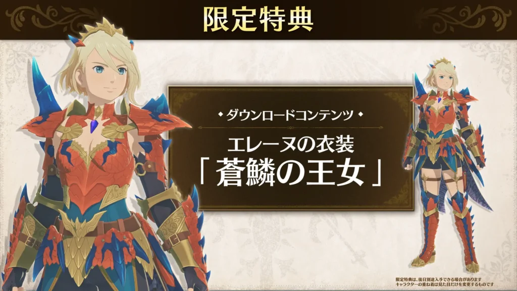 | エレーヌの衣装:蒼鱗の王女 | 仲間キャラ・エレーヌの見た目を変更できる重ね着衣装。蒼鱗のリオレウスをモチーフにしたデザイン | ダウンロード版予約またはパッケージ版早期購入特典。有効期限2027年3月12日まで |