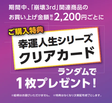 オープン日の3月20日から、崩壊3rd関連商品を税込2,200円以上購入するごとに、幸運人生シリーズのクリアカードが1枚もらえる購入特典が実施されます。