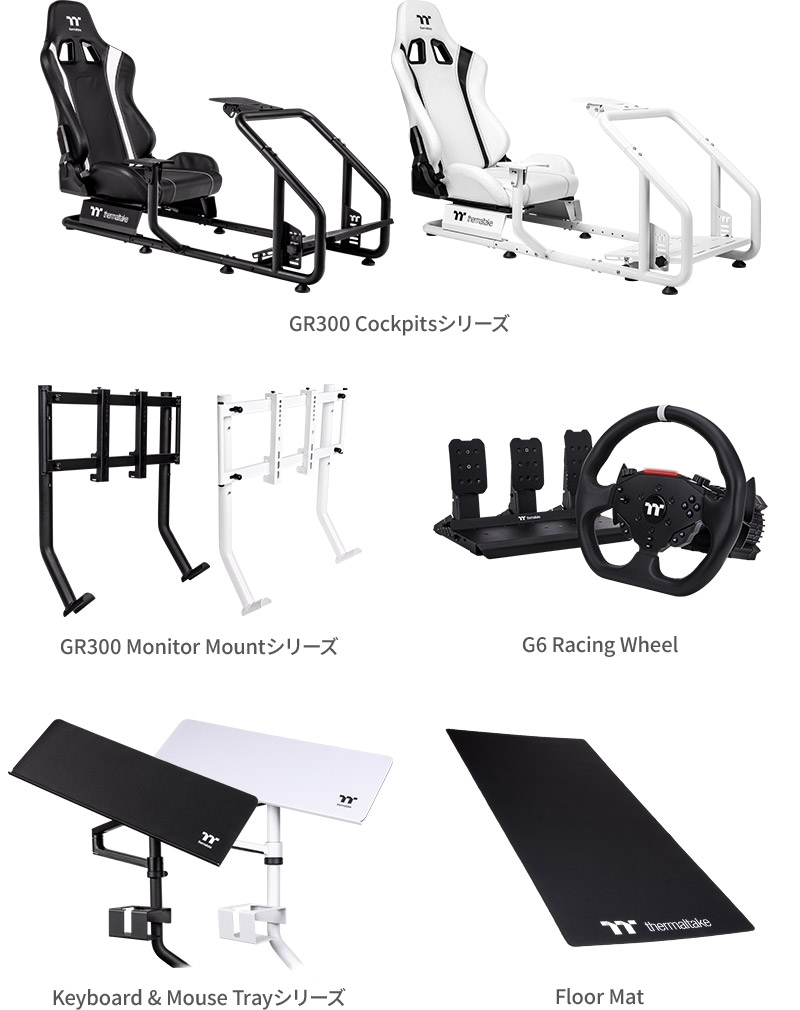 Thermaltakeが手がけるレーシングコックピット「GR300」シリーズです。国内代理店の株式会社アスクを通じて、本体フレームからモニターマウント、ステアリングホイール、オプションアクセサリーまで一括で展開される構成になっています。